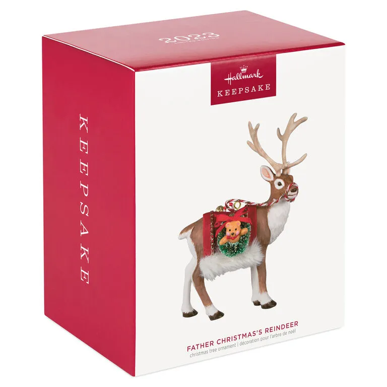 Welcome the wonder of the season with this handsome Christmas tree ornament. The regal reindeer features a fabric saddle blanket trimmed with faux fur and adorned with a tiny teddy bear and bottlebrush wreath attachment on one side, and a sack filled with toys on the other. Coordinating 2023 Father Christmas ornament sold separately.