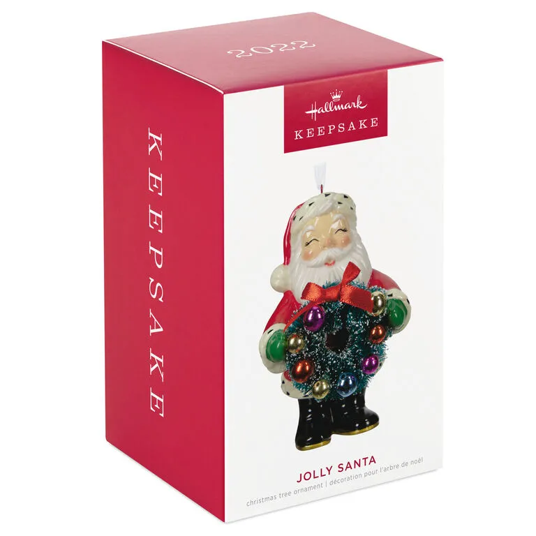 Make the season extra jolly when you display this premium porcelain Christmas tree ornament. The rosy-cheeked Santa Claus with a cheery expression holds a bottle brush wreath with red ribbon bow attachment. Charming retro styling makes the design even more festive.