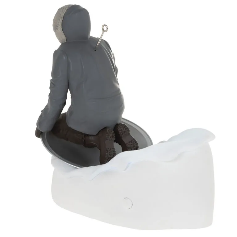 Rev up some holiday laughs with this fun Christmas tree ornament from the classic holiday movie “National Lampoon’s Christmas Vacation.” Perched on his lubricated saucer sled on a snowy sledding hill, Clark’s startled expression relives the humorous scene. Press the button to see the decoration light up and hear dialogue from the movie. Later, dudes!