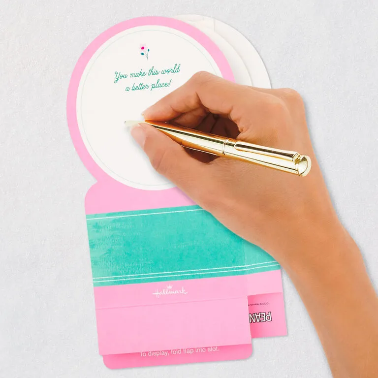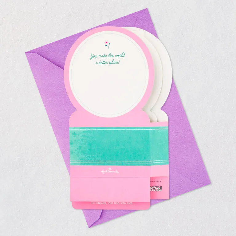 Pop-up Mother’s Day greeting card features a laser-cut, three-dimensional scene of Snoopy from Peanuts holding a bouquet of flowers for her in a 3D molded plastic snow globe-style design. Musical card plays a cheerful instrumental tune while confetti blows inside when button on front is pressed. Simply unfold the card (no assembly required) to create a fun surprise that can be displayed all year long. When open for display, 3D pop-up card measures approx. 7.13″ H.