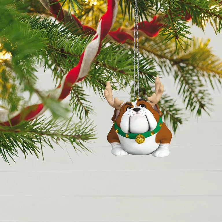 Deliver a dose of holiday whimsy with this fun Christmas tree ornament. Decked out with a stately set of reindeer antlers and a jingle bell collar, this bulldog “reindoggie” is full of holiday spiritāwhether he likes it or not.